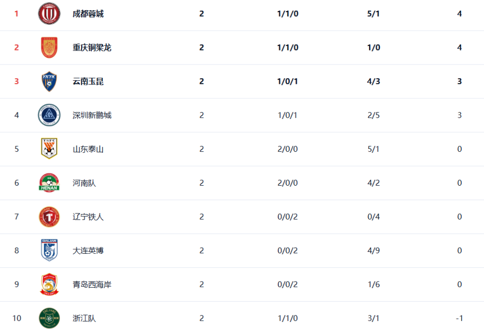 前2轮之后,成都蓉城以6分继续领跑积分榜,重庆铜梁龙以4分排名第2位。3月21日,成都蓉城客场对阵重庆铜梁龙,这场川渝德比也将是榜首之战。